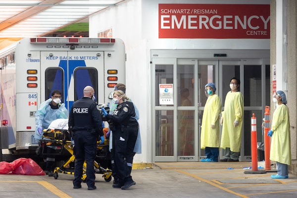 Hospital staff dressed in protective equipment standby as a patient is taken out of an ambulance at Toronto's Mount Sinai Hospital on March 29, 2020.Chris Young/The Canadian Press