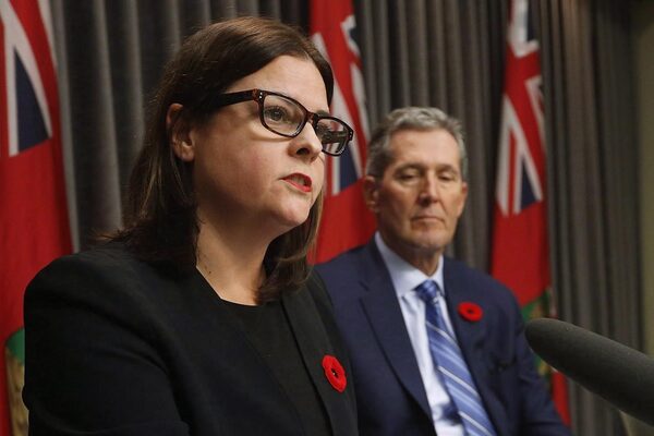 Families Minister Heather Stefanson, seen here with Premier Brian Pallister on Nov. 7, 2017, said Friday that the practice of birth alerts was working against efforts to build trust with mothers to connect them with child-care programs and supports.John Woods/The Canadian Press