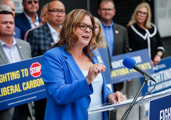 Manitoba PC Leader and Premier Heather Stefanson announces the start of the provincial election process with supporters and candidates in Winnipeg, Manitoba on Sept. 5.JOHN WOODS/The Canadian Press
