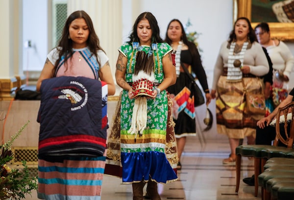 Belongings of Grand Chief Cathy Merrick are carried into a ceremony at the Legislature in Winnipeg on Sept. 11.JOHN WOODS/The Canadian Press