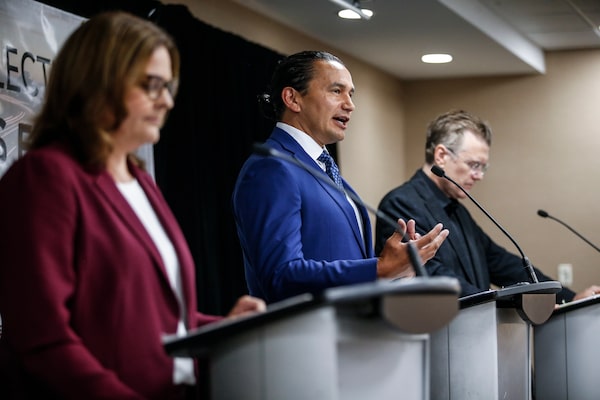 Left to right: PC Leader Heather Stefanson, NDP Leader Wab Kinew and Liberal Leader Dougald Lamont take part in the Party Leaders Forum – Growing the Economy, in Winnipeg, Sept. 12.JOHN WOODS/The Canadian Press