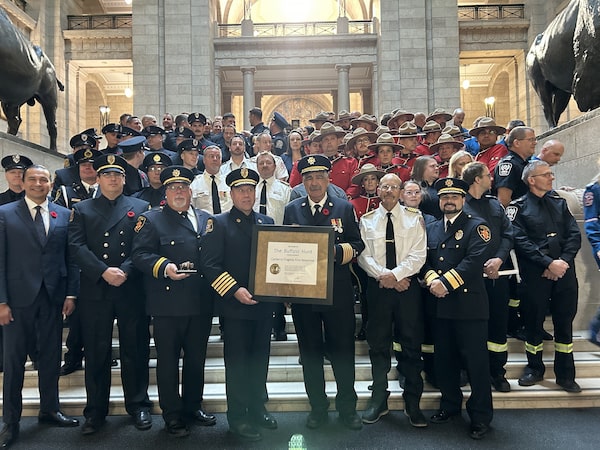 Some of the first responders awarded the Order of the Buffalo Hunt by Manitoba Premier Wab Kinew, front left, are seen on the staircase of the legislature in Winnipeg on Oct. 28.Steve Lambert/The Canadian Press