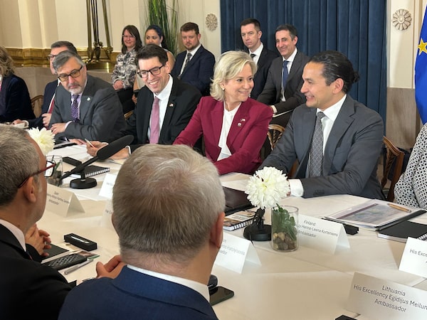 Genevieve Tuts, Ambassador of the European Union to Canada, centre, and other representatives of European Union countries met with Manitoba Premier Wab Kinew, right, at the Maniotba legislature in Winnipeg on April 15.Steve Lambert/The Canadian Press