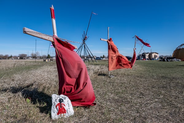 Red dresses on crosses are displayed at the entrance of a makeshift camp near the Prairie Green landfill in Winnipeg, on April 27.SEBASTIEN ST-JEAN/Getty Images