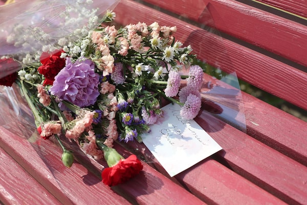 A bouquet of flowers sits on a red bench in front of the Mrs. Lucci’s Resource Centre in Lac du Bonnet, Man., the café and used houseware store that Sue Nowell called her second home.