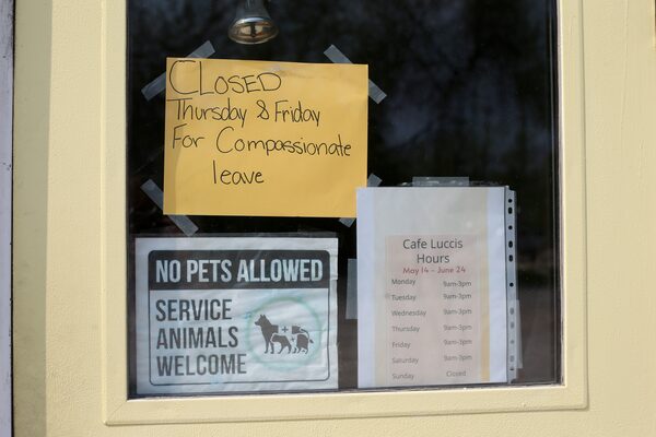A sign on the door of Lucci’s Too in Lac du Bonnet, Man., reads 'Closed Thursday & Friday for compassionate leave,' on May 15, 2025.Shannon VanRaes/The Globe and Mail