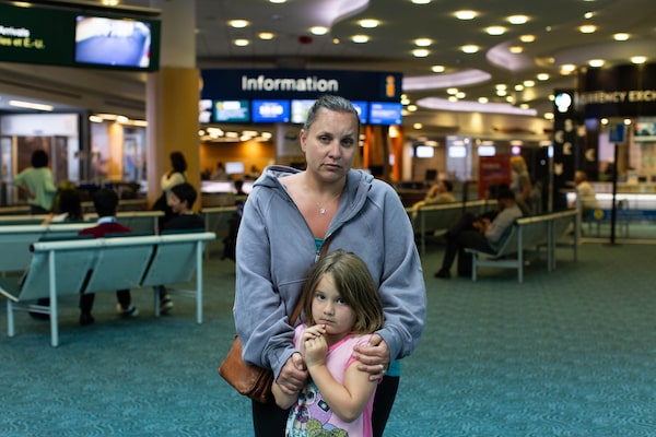 Marla Strobel stands with her daughter at the Vancouver International Airport on Aug. 11 after fleeing from a devastating wildfire in Lahaina, Hawaii.Jackie Dives/The Globe and Mail