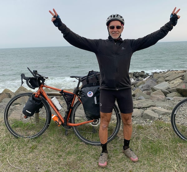 McGill University professor Larry Lessard stands with his bike by the ocean in Japan. He had planned to visit universities in England, Sweden, Belgium and Japan during a sabbatical year, but decided instead to bike around the world.Supplied