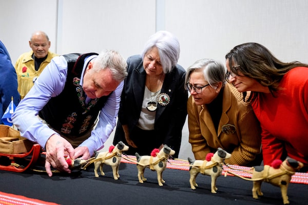Canadian poet Gregory Scofield, left, Gov. Gen. Mary Simon, Métis Nation of Ontario president Margaret Froh and President of Otipemisiwak Métis Government Andrea Sandmaier, take part in an unveiling of a model Métis Dog Sled at the Canadian Museum of History in Gatineau, Que., on Wednesday.Spencer Colby/The Canadian Press