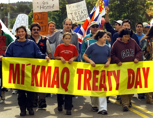 Donald Marshall Jr., middle, takes part in a peaceful protest over Indigenous fishing rights in Sydney, N.S., in 2000.Andrew Vaughan/The Canadian Press/CP