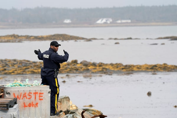 A RCMP officer signals to another officer on Oct. 17 as they search the shoreline after the Middle West Pubnico fire.John Morris/Reuters/Reuters