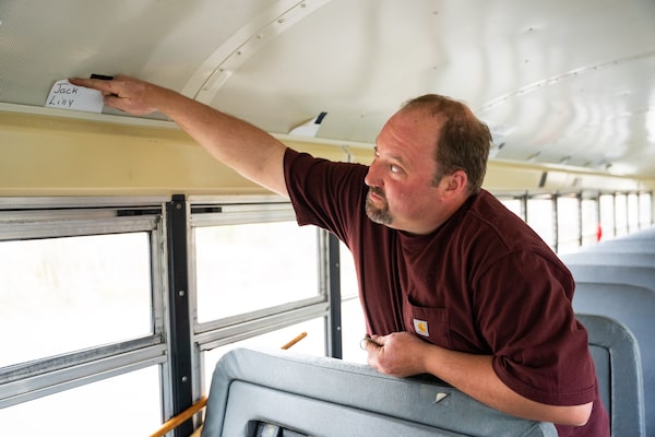 Bus driver Bryan Ward shows where missing children Jack, 4, and Lilly Sullivan, 6, sat on his bus on May 8, 2025.Steve Wadden/The Globe and Mail