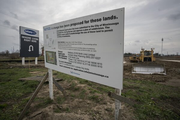 “Imagine living right here,” reads one sign, surrounded by heavy equipment and expanses of mud, the drone of Highway 407 audible in the distance.