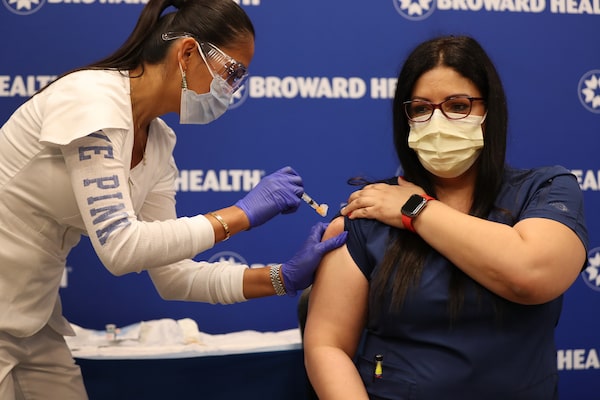 Leonida Lipshy, RN in the COVID unit at the Broward Health Medical Center, gives Lissette Gutierrez, RN, assistant nurse manager in progressive care unit, Broward Health Imperial Point, a shot of the Moderna COVID-19 vaccine on December 23, 2020 in Fort Lauderdale, Florida.Joe Raedle/Getty Images