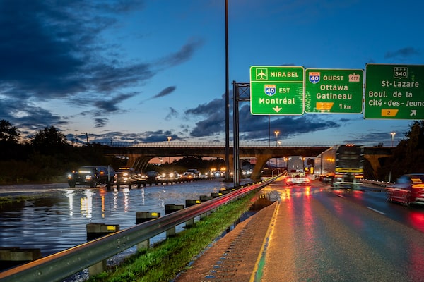 Vehicles drive slowly through water overflowing on to Highway 30 in Vaudreuil-Dorion, west of Montreal, on Aug. 9.Peter Mccabe/The Canadian Press