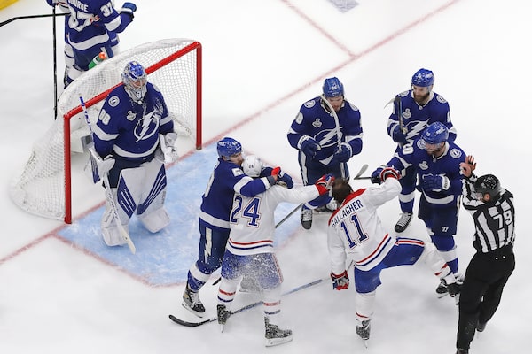 The Tampa Bay Lightning and Montreal Canadiens scuffle during the third period in Game 1 of the 2021 NHL Stanley Cup Final at Amalie Arena on June 28, 2021, in Tampa.Mike Carlson/Getty Images