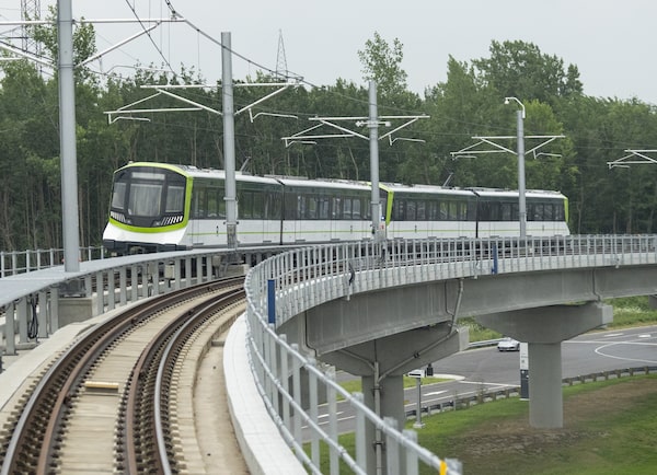 A Réseau express métropolitain (REM) light-rail system train on the tracks in Brossard, Que., on July 28.Christinne Muschi/The Canadian Press