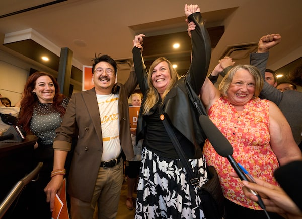 NDP candidate Leila Dance (middle) celebrates as she is elected a member of Parliament representing Winnipeg’s Elmwood-Transcona riding at the NDP celebration party in Winnipeg on September 16, 2024.david lipnowski/The Canadian Press