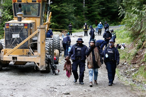 Members of the RCMP escort a protester who is under arrest after chaining her arm inside a device buried in a logging road at an old-growth logging blockade near the Fairy Creek watershed on Wednesday.Jesse Winter/The Globe and Mail