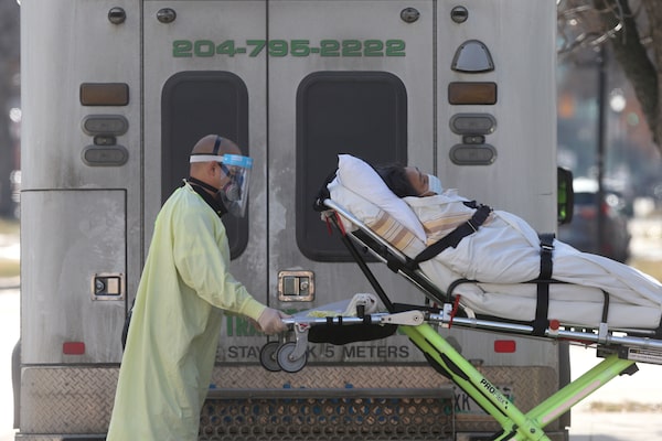 Employees of a stretcher service wear personal protective gear as they return a resident to Parkview Place personal care home, which is experiencing an outbreak of the coronavirus disease, in Winnipeg, November 2, 2020.SHANNON VANRAES/Reuters