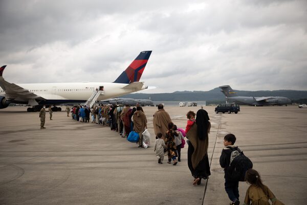 Afghan evacuees board a civilian airplane after a stay at Ramstein Air Base in Germany, on Monday, August 30, 2021. Many of the troops and officials involved in the evacuation mission at Ramstein have spent time in Afghanistan themselves, making the assignment here a personal one.GORDON WELTERS/The New York Times News Service