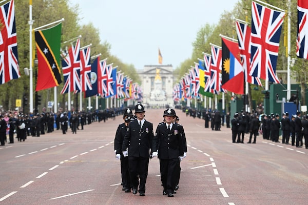 A general view of Metropolitan Police officers arriving on The Mall ahead of the Coronation of King Charles III and Queen Consort, May 6, 2023 in London, England.Charles McQuillan/The Associated Press