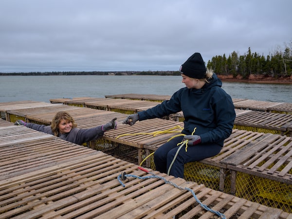 Courtney Stevenson works with her mother Connie attaching tags to lobster traps ahead of Setting Day.Nathan Rochford/The Globe and Mail