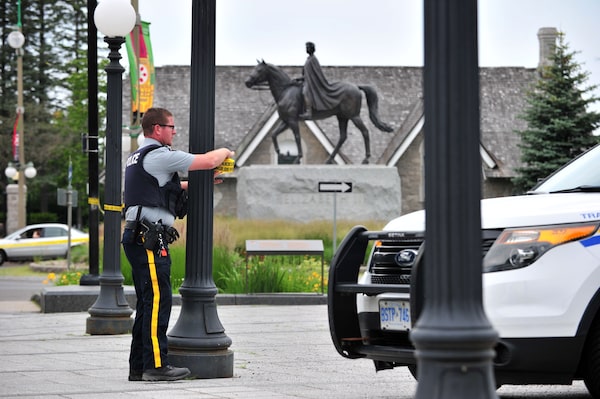 A Canadian police officer patrols near the grounds of the Ottawa estate that is home to Prime Minister Justin Trudeau and the country's governor general on July 2, 2020 in Ottawa, Ontario. Canadian police on Thursday arrested an armed man who entered the grounds of an Ottawa estate that is home to Prime Minister Justin Trudeau and the country's governor general.MOHAMED KADRI/AFP/Getty Images