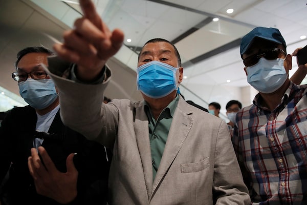 Hong Kong businessman and media tycoon Jimmy Lai, middle, leaves a court after he was found not guilty in a case accusing him of criminal intimidation in Hong Kong, Thursday, Sept. 3, 2020. The case dates back to an incident in 2017, when a reporter from the Oriental Daily newspaper said Jimmy Lai used intimidating language toward him in public.Kin Cheung/The Associated Press