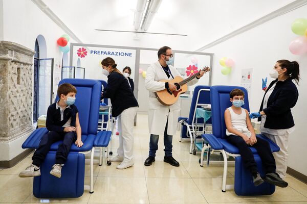 A health worker plays a guitar while Francesco, 8, and Lorenzo, 11, receive their first doses of COVID-19 vaccine at Nuovo Regina Margherita Hospital, as Italy begins vaccinating children 5 to 11 years old in Rome, Dec. 15, 2021.YARA NARDI/Reuters