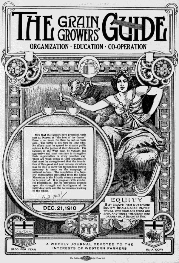THE GRAIN GROWERS GUIDE: A WEEKLY JOURNAL DEVOTED TO THE INTERESTS OF WESTERN FARMERS (Dec. 21, 1910, edition). Text at centre, left, says 800 farmer delegates from across Canada descended on Ottawa to try to get the Liberal government to act on a number of agricultural grievances in December, 1910. Courtesy of University of Alberta LibrariesCourtesy of University of Alberta Libraries