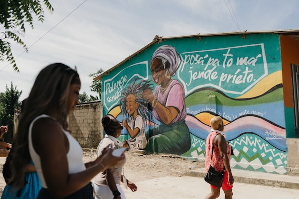 Tourist walk past a mural dipicting a woman brading a girls hair in Palenque, Colombia, Feb. 4, 2025.Yader Guzman/The Globe and Mail