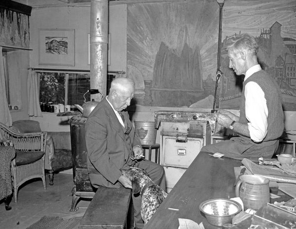 CANADA-WIDE REUNION OF ADMIRERS TO HONOUR JACKSON AT ART GALLERY -- Famed member of Group of Seven, artist A.Y. Jackson (left), who pioneered realistic outdoor school of art in Canada, is seen October 15, 1953. Jackson finishes breakfast with Keith MacIver, mining prospector artist, in Tom Thomson shack behind Studio Building (25 Severn Street) in Toronto. The dog is MacIver's Dalmatian, named Peggy. Incidentially, Jackson will remind you that the art world owes a debt to MacIver for having restored the famous shack when it was on the point of falling down. Credit: The Globe and Mail (Neg. 53289-03) Originally published October 22, 1953The Globe and Mail