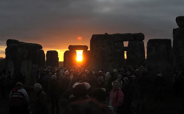 People watch the sunrise at the winter solstice celebration at Stonehenge in Wiltshire, Dec. 22, 2011.Tim Ireland/PA Images via Reuters Connect