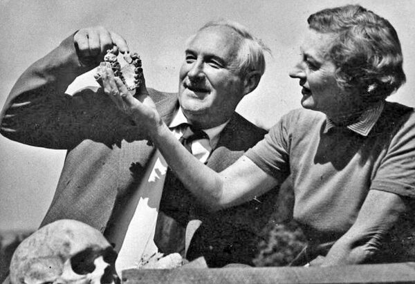 Mary Leakey, right, holding the jaw of “Zinj” as husband Louis Leakey points out a feature of the fossil. Mary Leakey had discovered the remains of human ancestor Zinj at Olduvai Gorge on July 17, 1959. The Leakeys called their new discovery Zinjanthropus boisei (Zinj is an old name for East Africa). They referred to it as “Zinj” or “Dear Boy.” The press nicknamed it “Nutcracker Man” because of its huge jaws and teeth. The Leakeys’ famous fossil find is now called Paranthropus boisei or Australopithecus boisei, and it occupies a significant, if not direct, branch on our family tree.The Leakey Foundation Archive