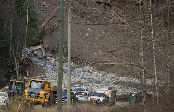 Emergency vehicles and tractors are seen at the base of a mudslide on Highway 7 west of Agassiz, B.C., Wednesday, November 17, 2021. THE CANADIAN PRESS/Jonathan HaywardJONATHAN HAYWARD/The Canadian Press