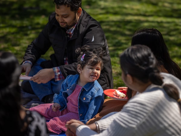 Shahban Beg sits behind his daughter Maryam for a picnic in Toronto on Mother’s Day 2025.Melissa Tait/The Globe and Mail