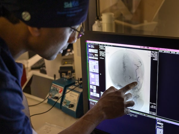 Dr. Prakash Muthusami the pediatric neurointerventionist who performed the procedure on Maryam, explains the location of coils in her brain imaging on May 15.Melissa Tait/The Globe and Mail