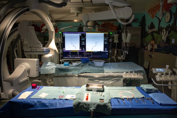 The angiography suite at the Hospital for Sick Children prepared as a demonstration for endovascular neurosurgery procedure, with Maryam Fatima’s angiogram images onscreen.Melissa Tait/The Globe and Mail
