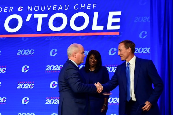 Newly elected Conservative leader Erin O'Toole greets his fellow candidates Peter MacKay and Leslyn Lewis after his speech following the Conservative party of Canada 2020 Leadership Election in Ottawa, Ontario, Canada August 24, 2020.SEAN KILPATRICK/POOL/Reuters