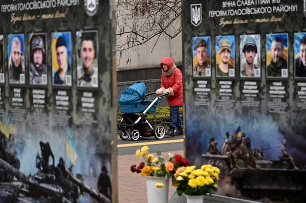 A woman with pram walks past portraits along the Alley of Fallen Heroes in a district of Kyiv on Dec. 7, 2025.SERGEI SUPINSKY/AFP/Getty Images