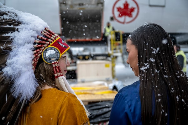 Representatives of First Nations groups wait as artifacts arrive from the Vatican are unloaded in Montreal on Saturday.Andrej Ivanov/The Globe and Mail