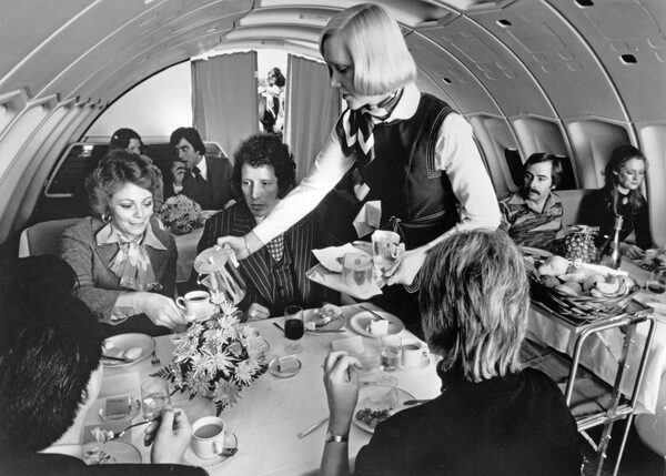 The 1970s is considered by many to be the peak era of inflight dining. As deregulation saw competition heat up and economy class grow in popularity, airlines needed to distinguish their first-class amenities. As seen in this Pan Am image from 1979, meal service was sumptuous. Caviar was nearly as common as pretzels are today, whole fruits were cut to order and lobster was the preferred white meat. Japan Airlines had a Teahouse in the Sky lounge on its 747 “Garden Jet.” In what was a novel move at the time, the now-defunct French airline Union de Transports Aériens hired famed chef Raymond Oliver to improve its gourmet cuisine. Portions were considerable and options were plentiful, with some airlines offering around 20 different menus. By the 1980s, though, the frills started to fade away as the era of penny-pinching and low-cost airlines began. Domini Clark