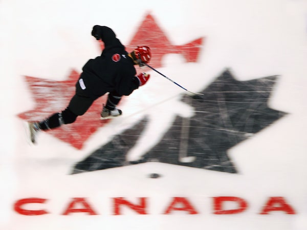 A members of Team Canada's World Junior team skates through the Hockey Canada logo at center ice at the MTS Centre in Winnipeg.Jeff Vinnick/Supplied