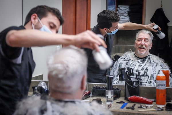 Barber Salim Alhaj, cuts the hair of client, John Gee, of Calgary, who came to the Kingsview Barbershop on its re-opening in Airdrie, Alta., Thursday, May 14. Jeff McIntosh / The Canadian PressJeff McIntosh/The Canadian Press