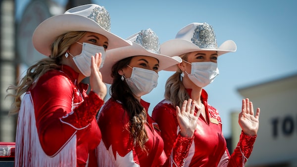 Calgay Stampede princesses Janelle MacKenzie, left to right, Kelcey Moore, and Madeline Kerkovius, wave to visitors during a drive-thru pancake breakfast as people try to enjoy the Calgary Stampede even though it has been cancelled in Calgary, Saturday, July 4, 2020.Jeff McIntosh/The Canadian Press