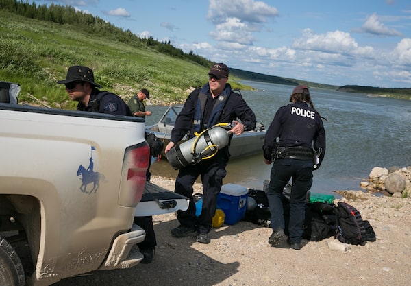 RCMP dive team members return from a dive in the Nelson River in Northern Manitoba on Sunday evening. The team searched eddies beyond the the lower rapids near where a banged up rowboat was spotted on Friday. The dive team was assisting in the search for triple murder suspects Bryer Schmegelsky and Kam McLeod.Melissa Tait/The Globe and Mail