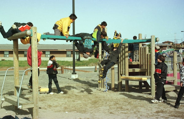 Since playgrounds came into existence about 150 years ago, they were occasionally boring – how many times can kids go up a slide then down a slide? – and dangerous, with cuts, splinters, falls and other injuries. And that was just the swing set. Now, modern playgrounds are made with much safer materials and with softer landings. And they offer children the chance to use their imagination – with climbing equipment, adventure playgrounds and interactivity. In the 1998 photo above, by The Globe and Mail’s John Gray, older children and youth make use of a new playground in Oujé-Bougoumou, Que., a Cree community on the shores of Opémisca Lake, about 750 kilometres north of Montreal. No longer is a playground just some stuff on vacant land – it’s a place bursting with colour where kids can experiment with creative ideas and have adventures, whether it’s scaling the wall, walking the bridge or living upside down. They’re the monarchs of the monkey bars. Philip King.