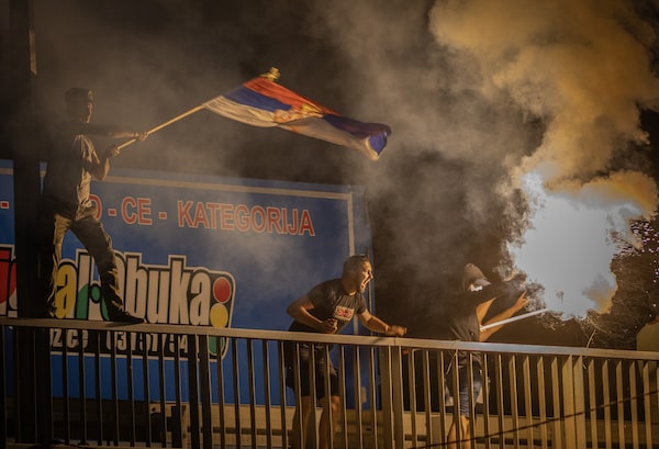 In Uzice, a two-hour drive south of Belgrade, men wave the Serbian flag and shout at police. In early July, protesters were trying to shut down a road connecting to Montenegro.GORAN TOMASEVIC/The Globe and Mail