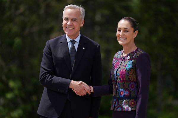 Prime Minister Mark Carney welcomes Mexican President Claudia Sheinbaum to the G7 Summit in Kananaskis, Alta., on June 17.DARRYL DYCK/The Canadian Press